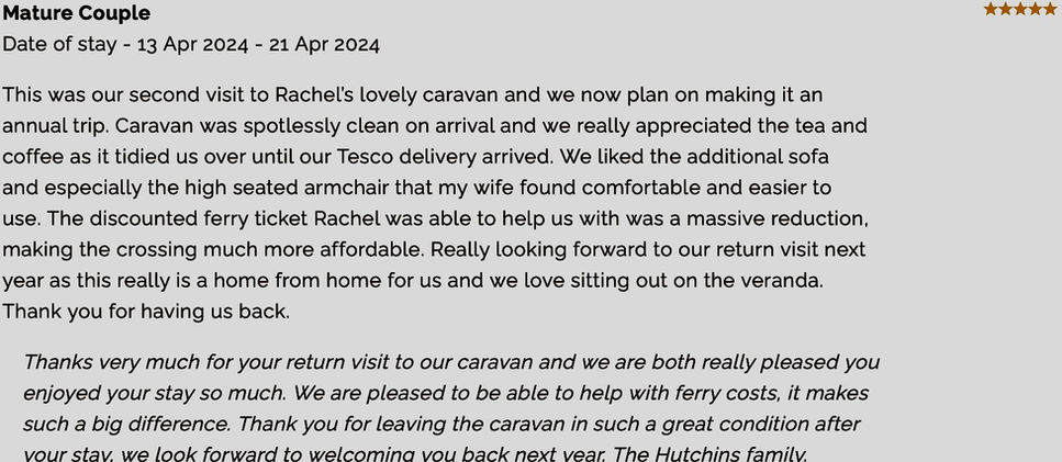 Below are screenshots taken of our reviews from Airbnb, ukcaravans4hire Google, and our guestbook.